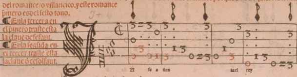 | Source title | En los roma[n]ces y villa[n]cicos q[ue] hay en este q[ui]nto libro sea d[e] guardar esta regla q[ue] estubiere[n] señalados d[e] colorado se an d[e] ca[n]tar co[n] la boz/y metan letra a donde estuuiere porque asi lo requiere la tonada del romance/o villancico. y este romance p[ri]mero es del sesto tono. En la tercera en el p[ri]mero traste esta la claue de fefaut. En la segunda en el tercer traste esta la claue d[e] cesolfaut. |